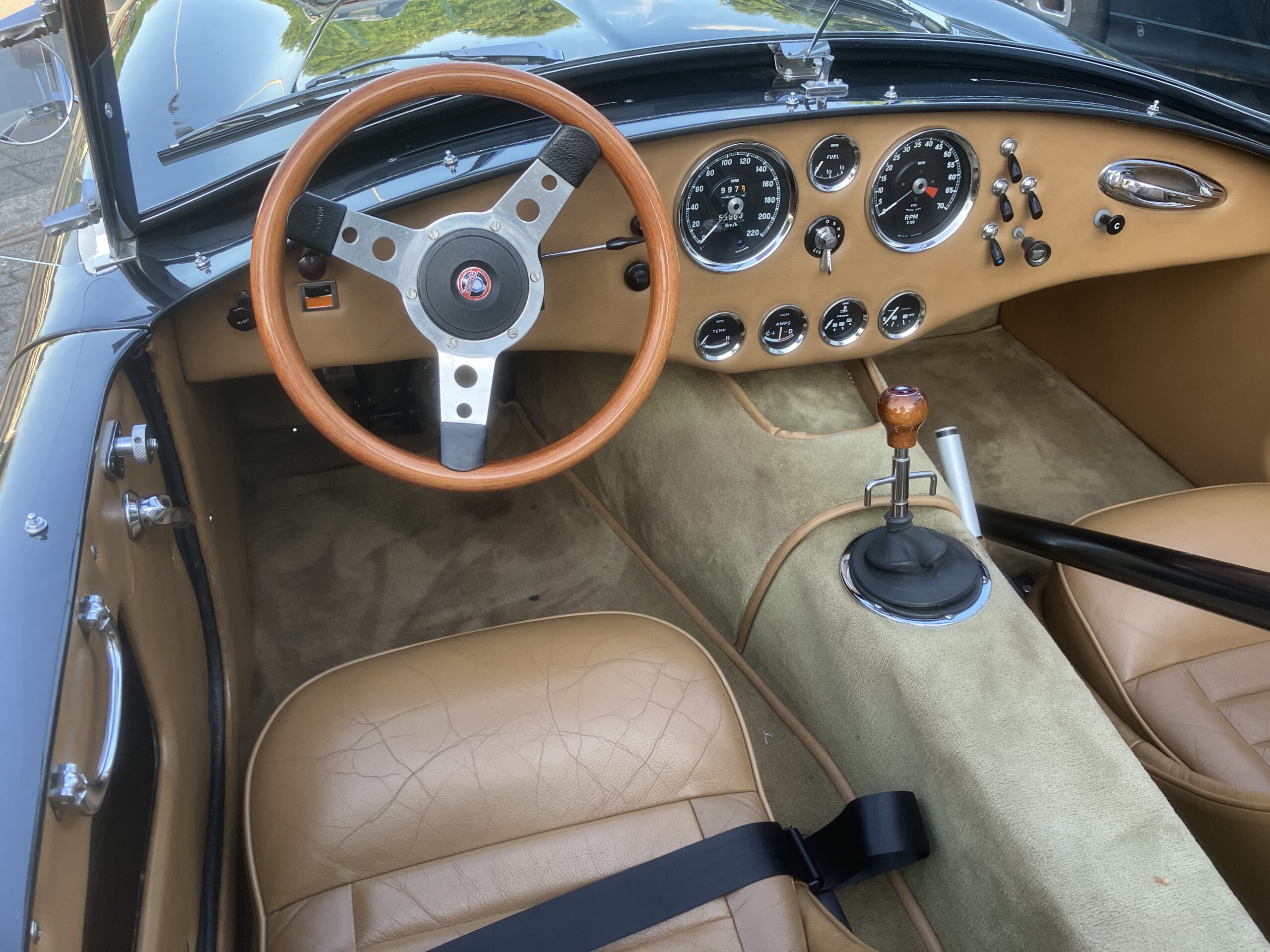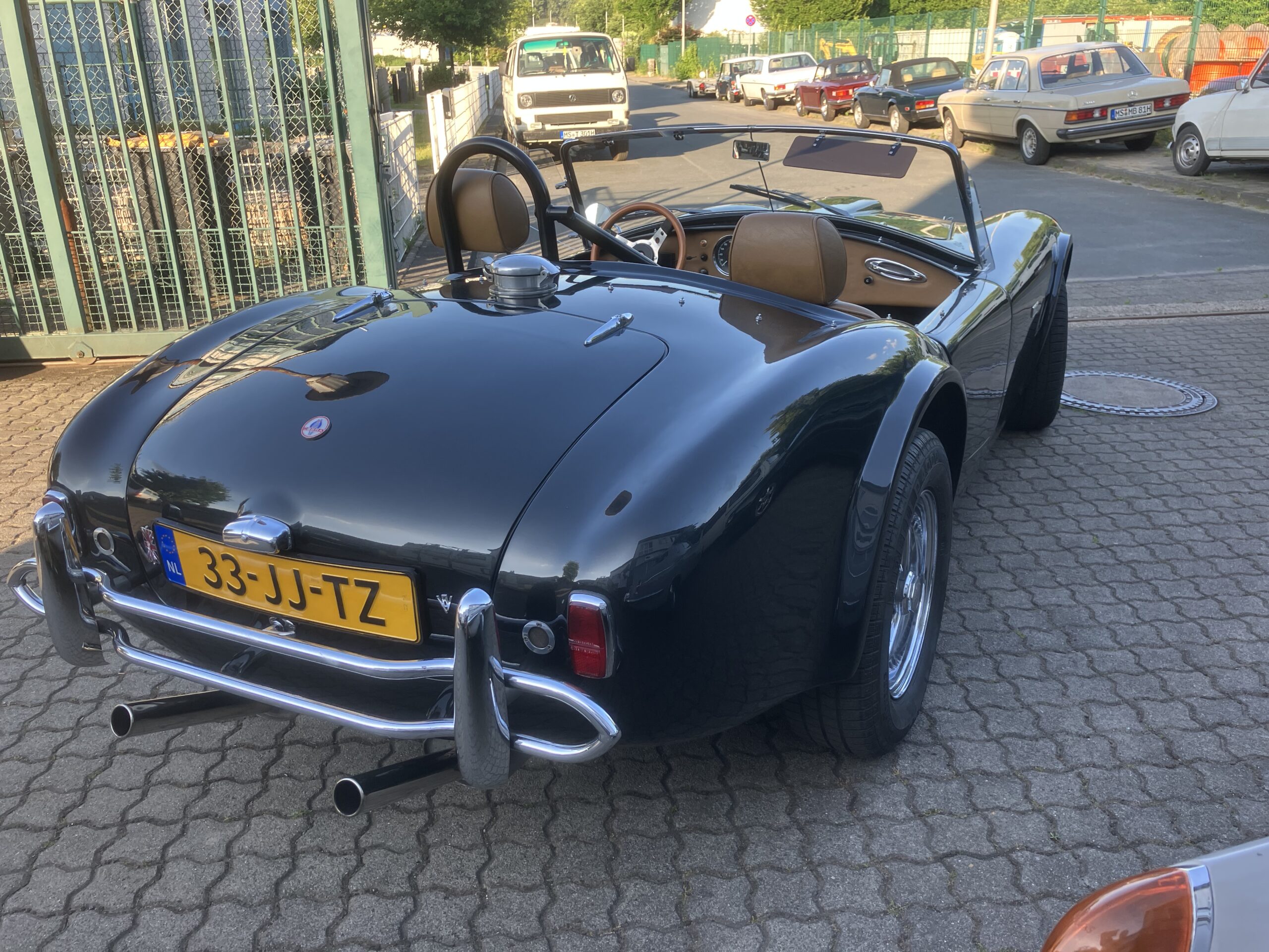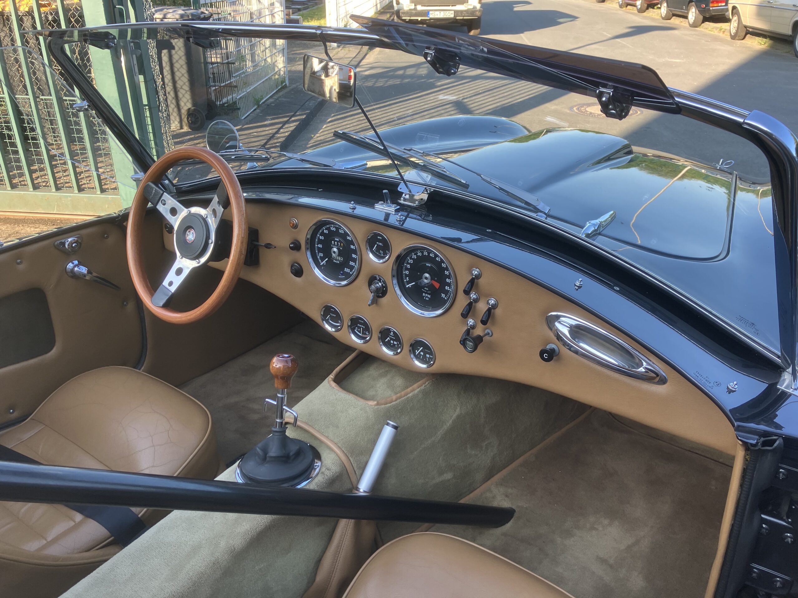 Dezente BRA Cobra Replika mit TÜV und H-Kennzeichen. Keine Side-Pipes, keine 500 PS, keine Jaguar Einzelradaufhängung, keine 50er Serie Breitreifen. Stattdessen eine linksgelenkte BRA Schmalcobra 289 FIA mit vollkommen ausreichendem 3,5 Liter Rover V 8, einem Ford 5-Gang-Getriebe und einer dem Original entsprechenden Starrachse hinten. Sehr gute Karosserie und Lackierung, schönes Interieur mit Schalensitzen und Kopfstützen. Das Fahrzeug ist 1982 gebaut worden mit den technischen Komponenten eines MGB GT V 8 bzw Morgan Plus 8 und korrekt zugelassen als BRA Cobra. Habe schon einige BRA-Cobras gehabt und schätze diese Fahrzeuge ein als sehr nahe am Original gestylt und von solider Qualität, was GFK-Karosserie und Stabilität angeht. Bringen Sie gutes Wetter zur Probefahrt mit!